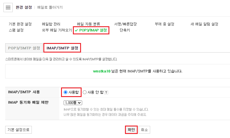 2) POP3/IMAP 설정 메뉴 => IMAP/STMP 설정 탭 => IMAP/SMTP 사용함 선택 후 확인 버튼 누르기