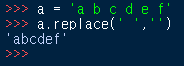 - 특정 문자열에서 모든 공백을 제거하고자 하는 경우 1)번에서 사용한 함수와 동일한 replace 함수를 통해 공백 제거가 가능합니다. replcace 함수 괄호안 작은 따옴표에 공백(' ')을 공백 없음('')으로 작성하여 문자열에 있는 모든 공백을 제거할 수 있습니다.