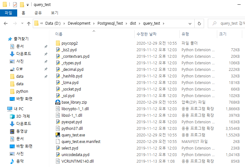 가) pyinstaller를 통해 하나의 exe 파일을 생성하는 것이 아닌, exe 파일 실행 시 필요한 부가적인 파일들도 같이 디렉토리 내에 표기 됩니다.