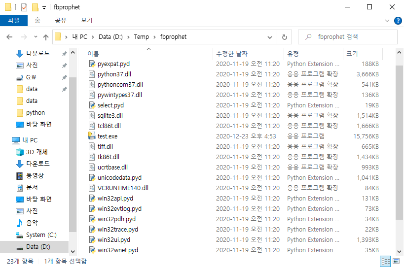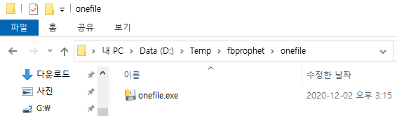 ※ 참고적으로 최근 Trend 분석 테스트로 인해 fbprophet 을 통해 코드 작성 후 실행파일을 생성한 경우가 있는데, exe 파일 하나로 묶은 경우 파일 사이즈가 압축이 되어서 300 MB 였었고, 디렉토리 형태로 만든 경우에는 압축이 되지 않아 1 GB가 좀 넘었습니다. 그리고 실행 속도는 exe파일로 만든 경우가 디렉토리 형태로 만든 파일 보다 2배 더 느린 속도를 보였습니다.