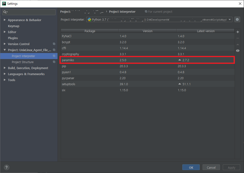 ( ※ 파이참이 아닌 pip 명령어로 설치하는 경우 "pip install paramiko==2.5.0" 명령어를 통해 설치 진행하셔도 됩니다.)